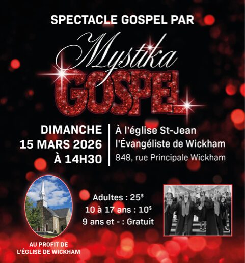 Un spectacle gospel par Mystika Gospel est organisé le 15 mars prochain à l’église St-Jean l’Évangéliste de Wickham. Billets et/ou informations : Mélanie 819 818-0561 ou [email protected] Josée 819 […]